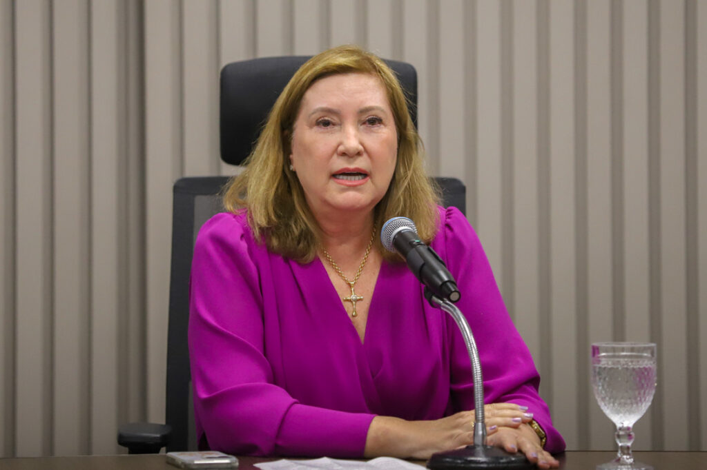 #ParaTodosVerem: Dra. Rita Penkal está sentada à mesa alta, falando ao microfone.